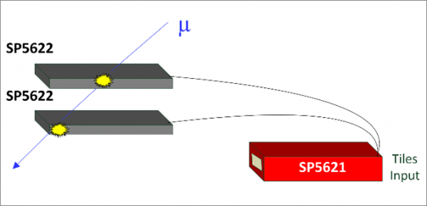 Когда заряженная частица проходит через чёрную плитку, её энергия преобразуется в сцинтилляционное излучение. Образовавшиеся фотоны улавливаются фотосенсором и преобразуются в электрический сигнал. Количество зарегистрированных событий (счётов) для каждого сцинтиллятора отображается на дисплее SP5621.
