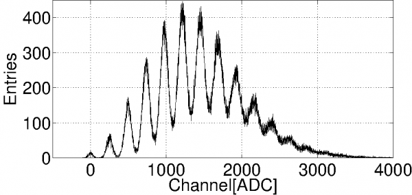 Пики в спектре соответствуют различному количеству сработавших ячеек SiPM, одновременно возбужденных приходящими фотонами.
