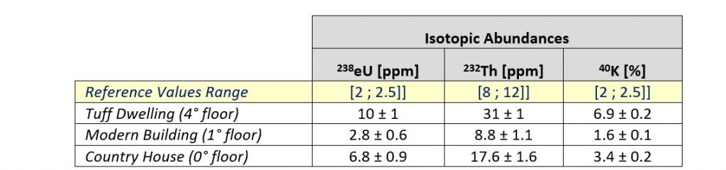 Результаты измерений сравниваются с эталонными значениями, характерными для земной коры. Различия в уровнях радиоактивности могут объясняться составом строительных материалов, расстоянием до почвы и другими факторами. Подобные измерения важны для оценки естественного радиационного фона от строительных материалов в соответствии с директивой 2013/59/Euratom и рекомендациями ЮНСКЕАР (Научный комитет ООН по воздействию атомной радиации).